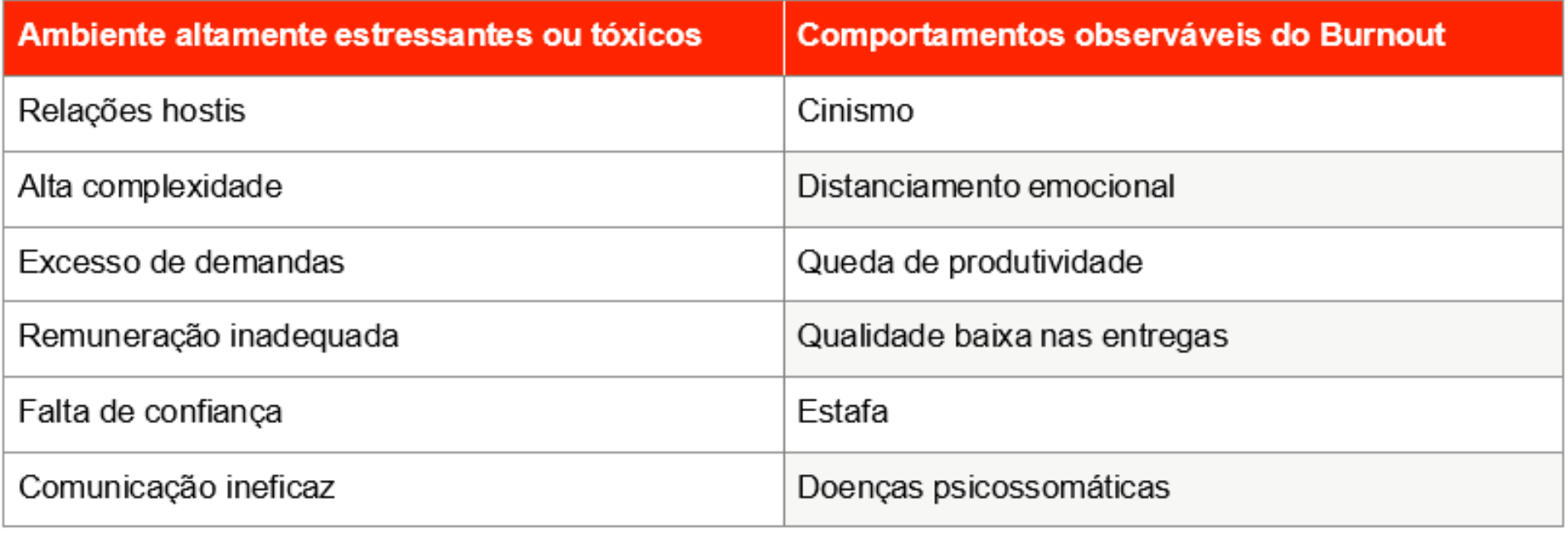 O Burnout pode ser identificado, quando ?cumpre? 3 características - Redução da Eficácia que pode ser percebida pelo atraso na entrega, a baixa qualidade e o retrabalho, o Cinismo que pode ser visto pelo descaso em relação ao trabalho e a Exaustão percebido pelo cansaço mental e ou físico.